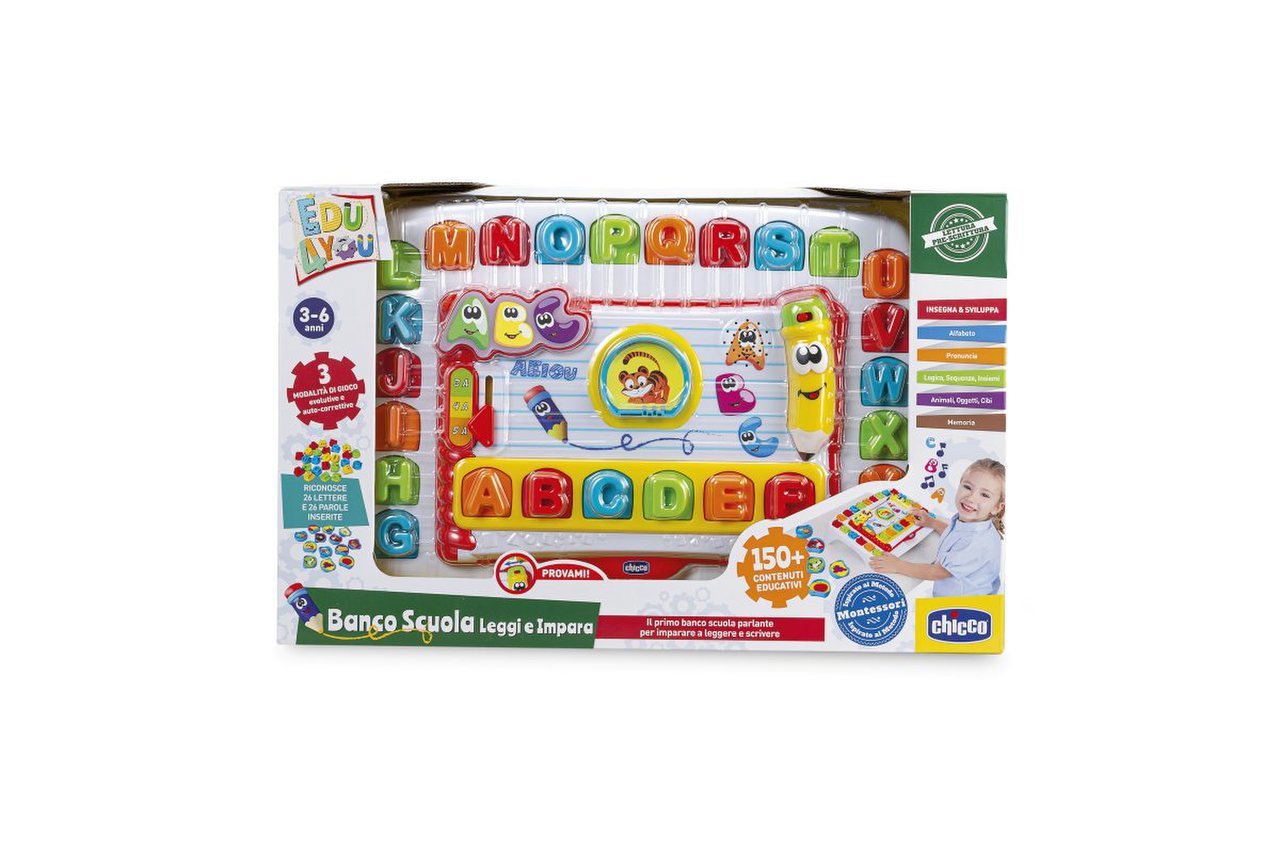 Reconheça letras, aprenda novas palavras, leia-as e finalmente escreva-as com a Mesa Escolar da Chicco, Ler e Aprender, a primeira mesa escolar falante e eletrónica que ajuda os seus filhos a aprender o alfabeto e a ler as primeiras palavras.