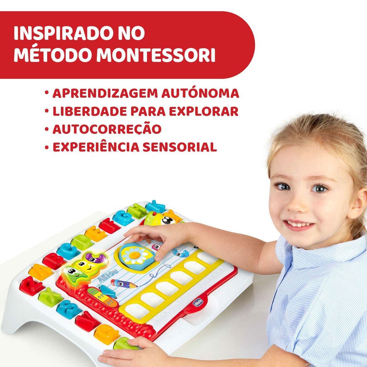Seguindo o método Montessori, as crianças podem brincar de forma autónoma coma Mesa Escolar da Chicco, Ler e Aprender, e aprender por conta própria através da autocorreção e do método de tentativa e erro, para aprender com os seus erros.