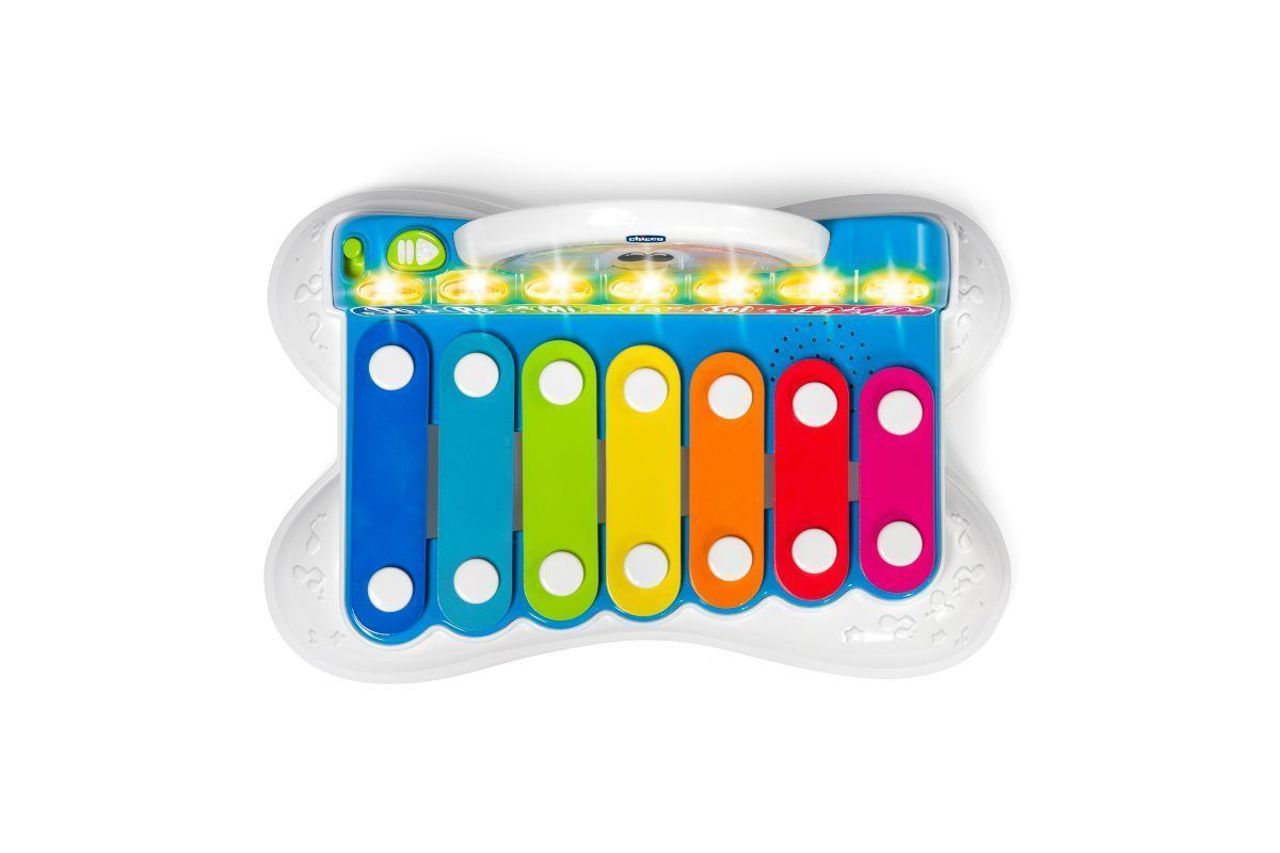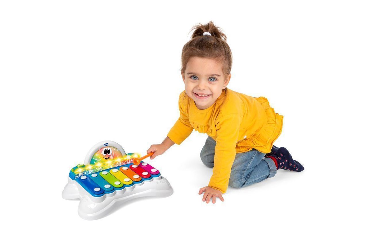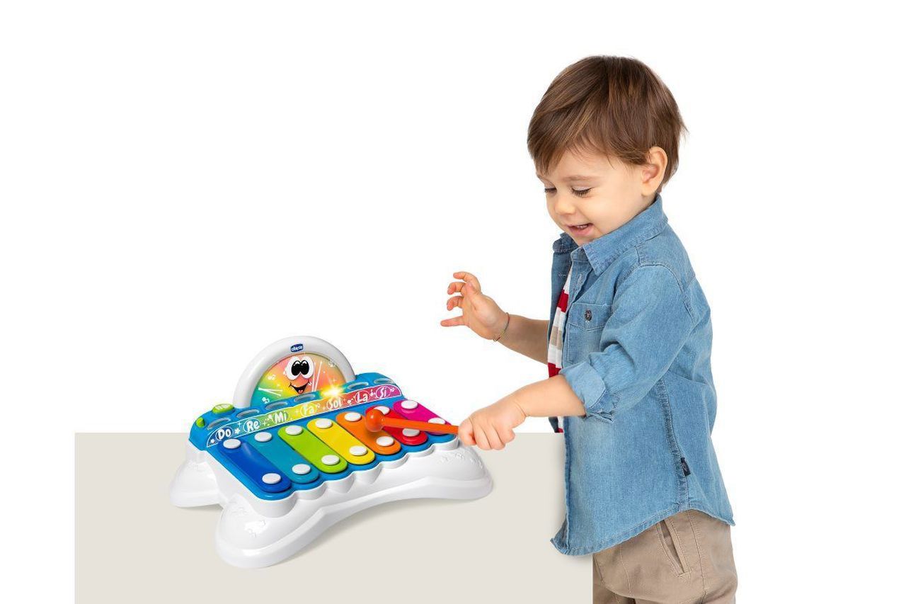 Brinquedo musical evolutivo 2 em 1 que combina o instrumento clássico com barras de metal e modos de jogo eletrónicos e interativos; ensina as notas musicais, a escala musical e sequência de sons.