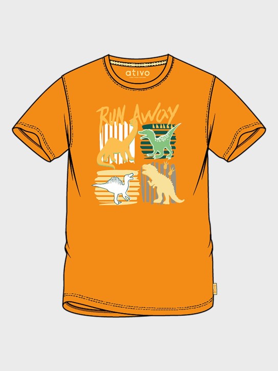 • Camiseta laranja com estampado de dinossauros e texto 'RUN AWAY'.